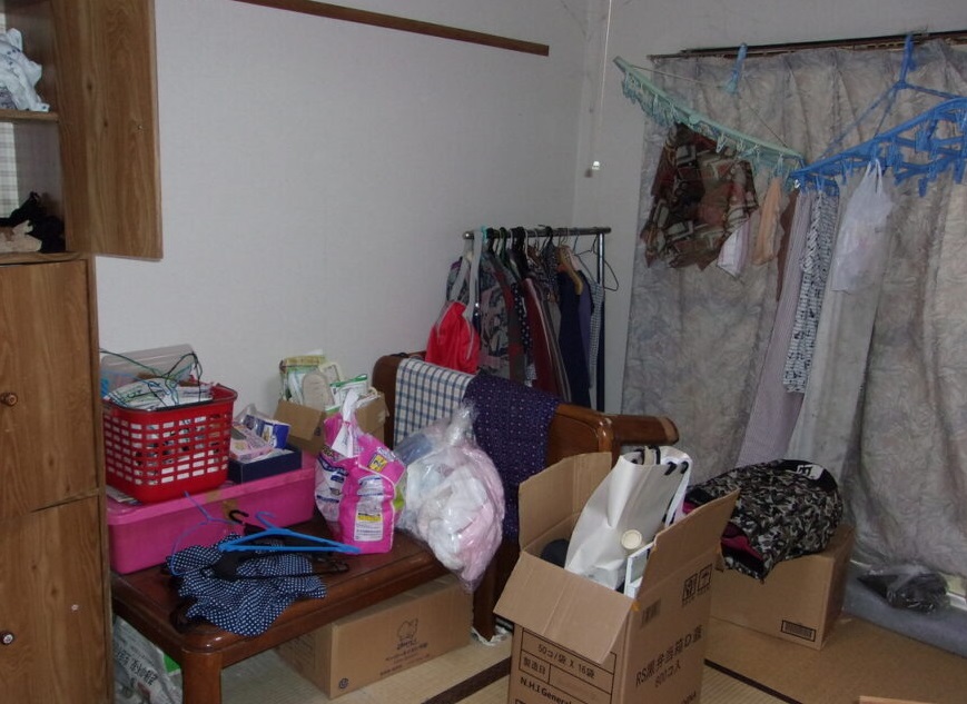 - 和室には衣類・段ボール・収納家具が多く残っている状態