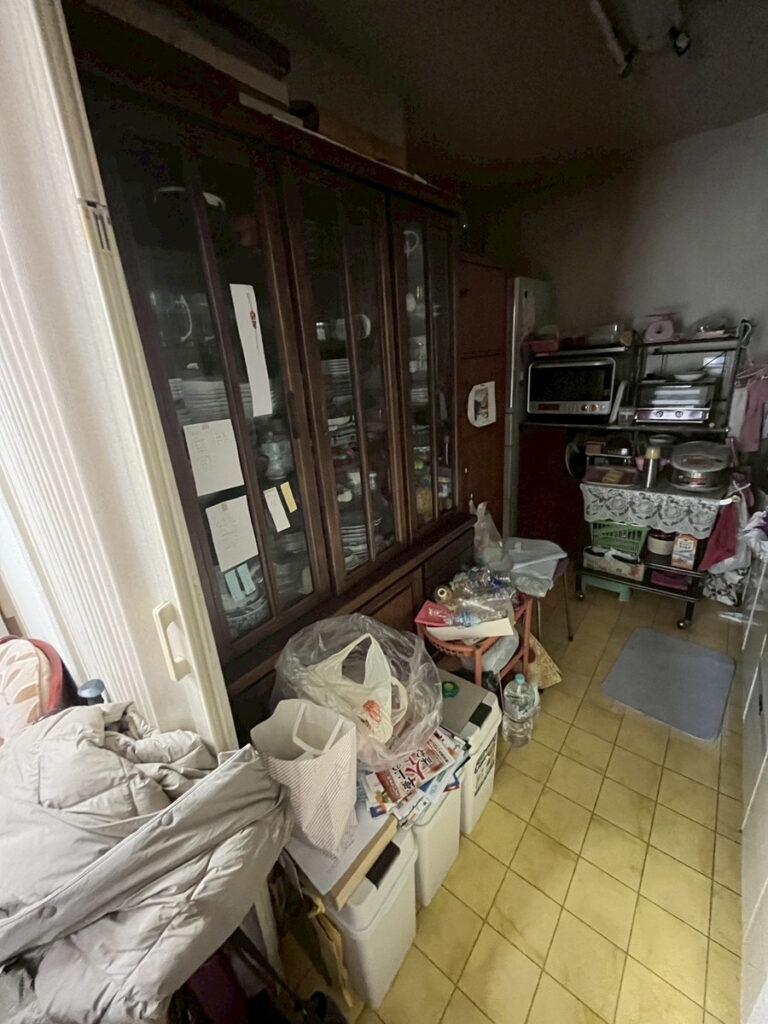 今回の現場では、キッチン、和室、玄関まわりをはじめ、室内のさまざまな場所に家具や生活用品、食器類、衣類、日用品などが残っており、家全体を整理しながら進める必要がありました。