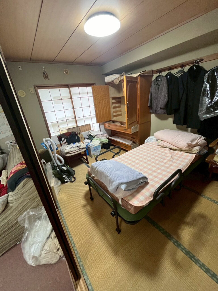 和室にはベッド、寝具、衣類、収納家具などがあり、生活空間として使われていた様子が残っていました。